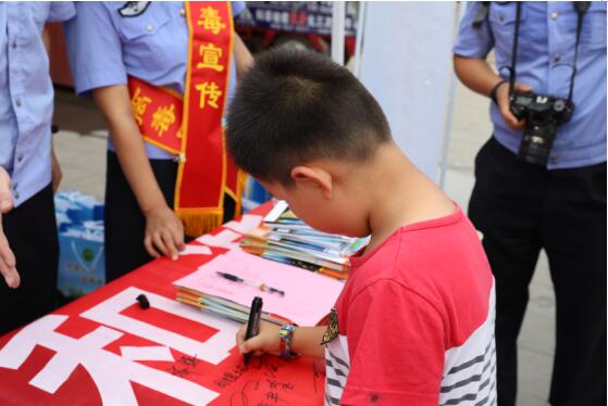 小朋友在远离毒品的横幅上签名