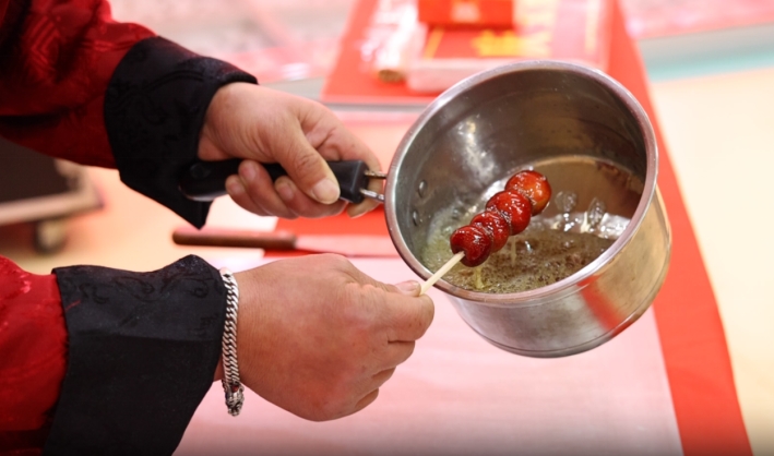 糖画艺人现场制作糖画环节更是吸引了很多人的眼球。只见糖画艺人手法娴熟、用糖稀绘制出了形态各异的糖画作品,引得人们纷纷驻足观看。